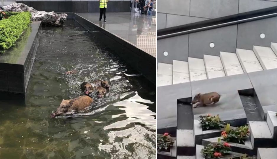 Last September, a group of four wild boars was spotted taking a dip in the fountains outside the Bank of China Tower in Central, Hong Kong. Wild boar have been known to wander into the city streets of Hong Kong. From police stations to malls, airport tarmacs to dumpsters, and even subway cars, these animals are often photographed in “civilized” settings where they do not belong. But how often do we question whether our city streets belonged in these mountains to begin with?
