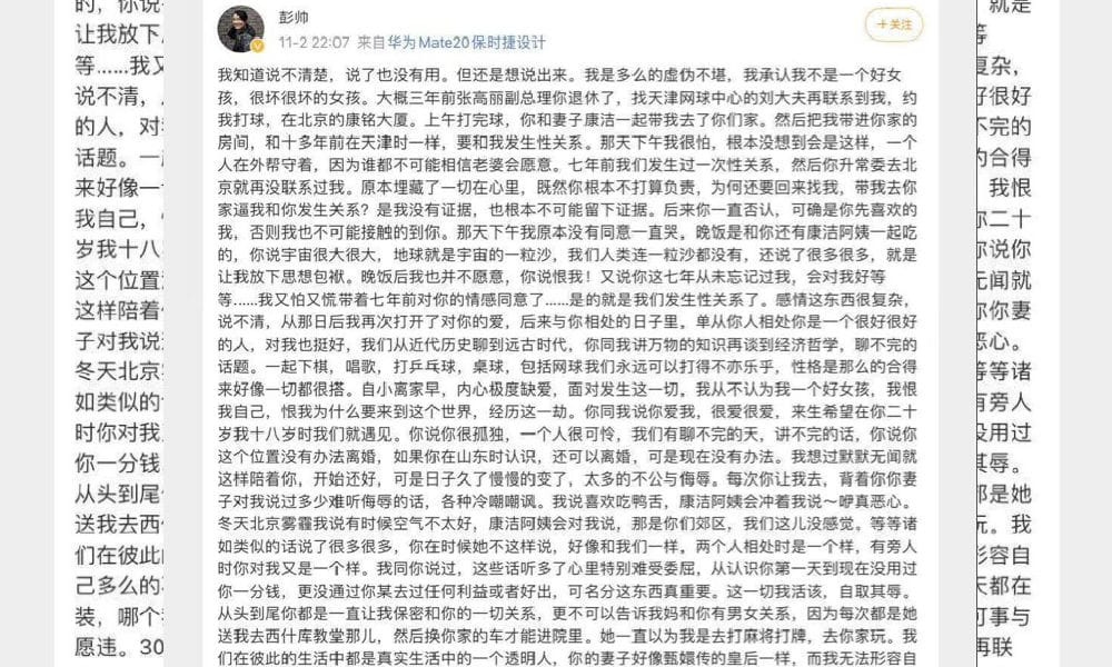 In her post, Peng goes into disturbing detail about the sexual assault Zhang Gaoli committed against her, and the events that had occurred since, from seven years ago leading up until the night of November 2nd.